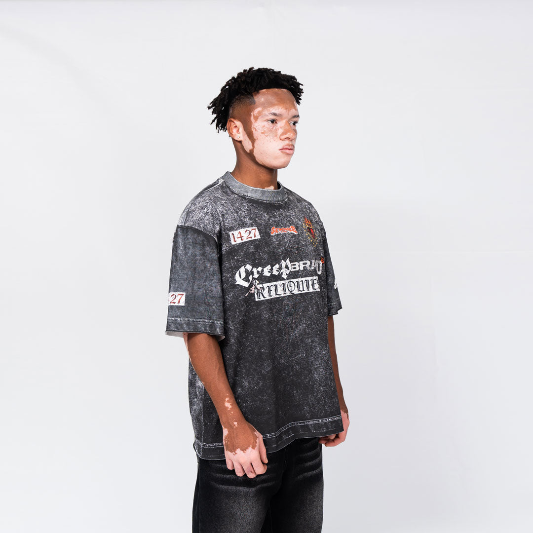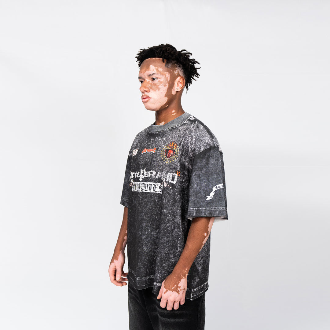 Camiseta oversize 100% algodón peruano de alto gramaje (260gr.) Acabado sin ruedo, cuello en rib de alto gramaje, Estampado full area tapa cuello marcado y marquilla tejida.