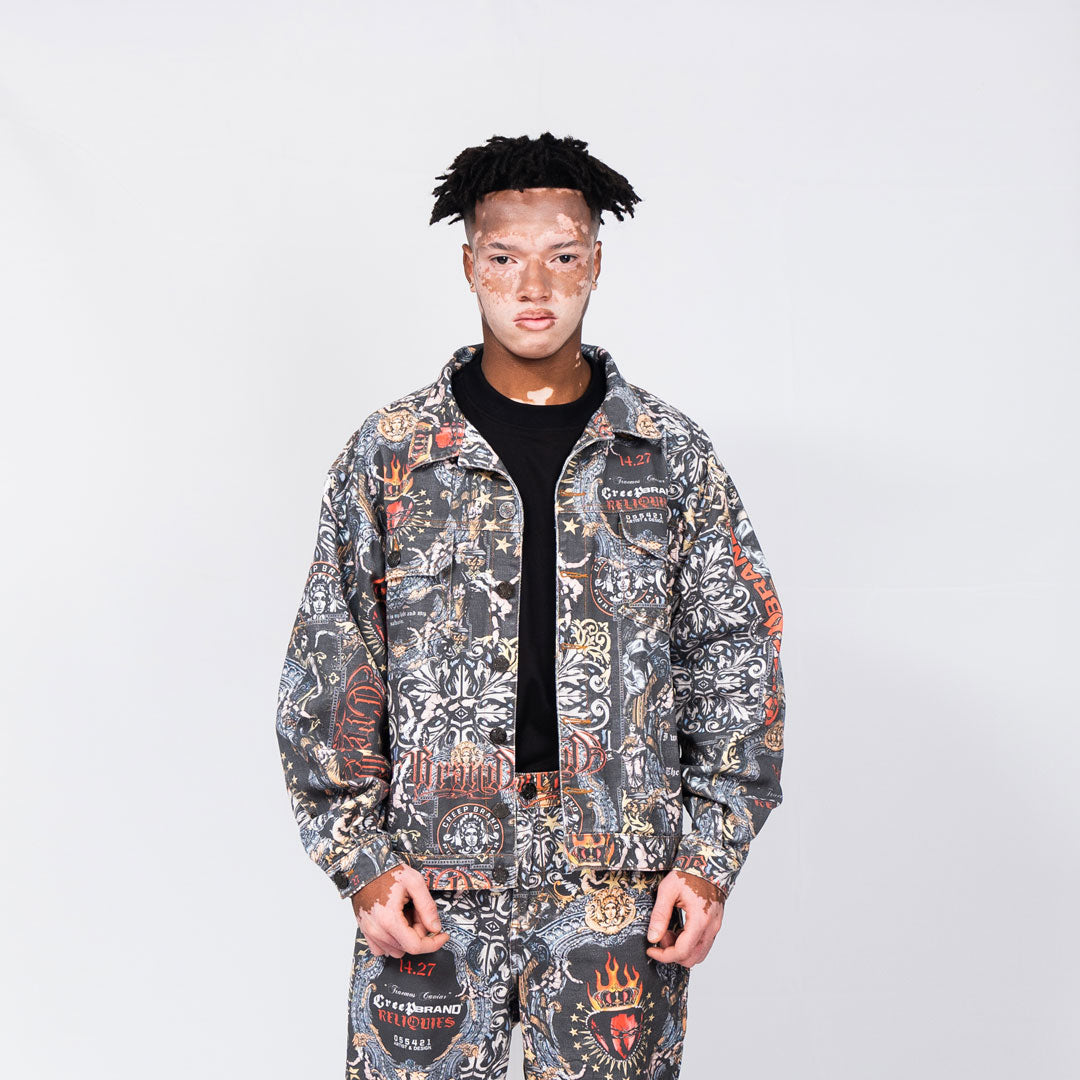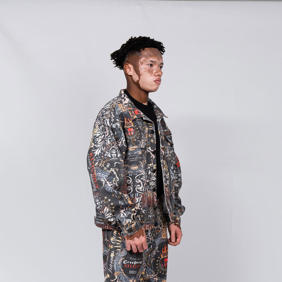 Chaqueta oversize en denim 100% algodon de alto gramaje, diseño con print total estampado. Perilla de botones. Tapas de bolsillo en frente. Bolsillos de ribete en laterales. Puños con botón. Charretera en pretina posterior.