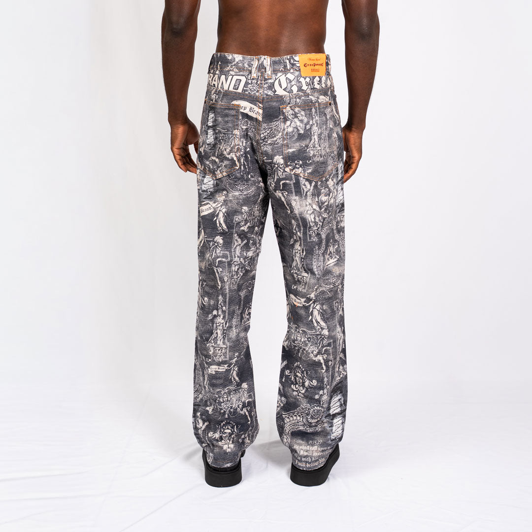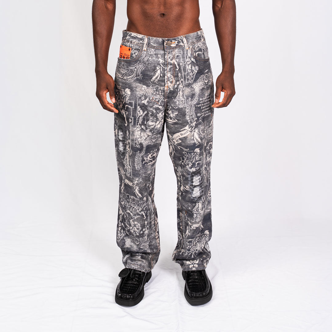 Jean bota recta, tiro bajo, en Denim 100% algodon de alto gramaje, diseño con print total estampado, 5 bolsillos y cierre delantero con cremallera.
