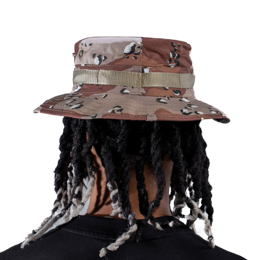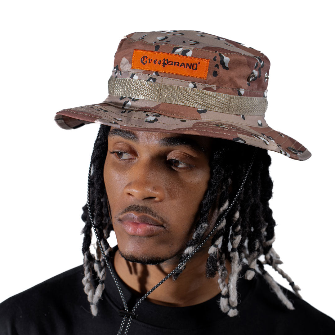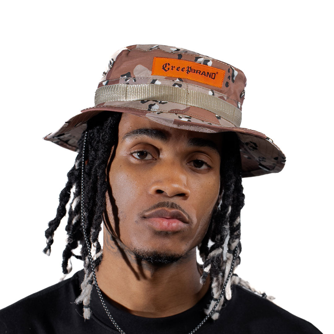 Pava SAHARA en ripstop 100% algodón, con estampado full desert camo. Marquilla tejida en el frente para un acabado premium y resistente, ideal para completar el look de la colección.